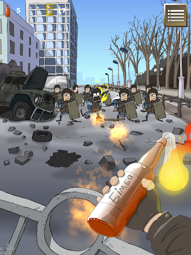 Твоя задача, використовуючи коктейлі Молотова, очистити рівень від садистів у погонах. Веди пальцем щоб задати напрямок, звіряйся з індикатором сили зверху і відпускай палець у потрібну мить, щоб здійснити влучний кидок! Гра зберігає хронологію подій: Грушевського, перехрестя Інститутської і Шовковичної, Грушевського зверху, Майдан, Інститутська біля Майдану. А на шостому бонусному рівні маєш змогу закидати коктейлями іноземних агресорів!