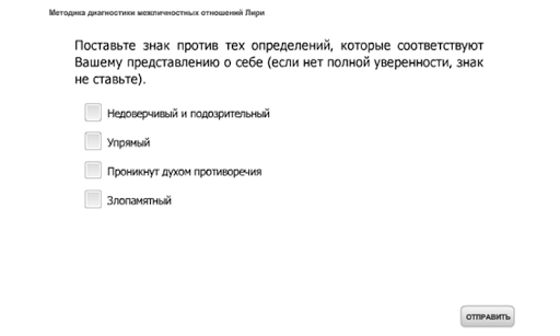 Разные направления диагностики позволяют определить тип личности, а также сопоставлять данные по отдельным аспектам. Например, "социальное "Я", "реальное "Я"", "мои партнеры" и т.д.
