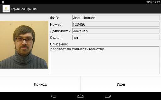 Мобильный NFC терминал СКУД Сфинкс позволяет регистрировать приходы и уходы сотрудников там, где невозможно установить полноразмерный терминал/считыватель/турникет/дверь. Просто поднесите карту сотрудника к мобильному устройству и нажмите соответствующую кнопку на экране - и проход сотрудника будет зарегистрирован.
