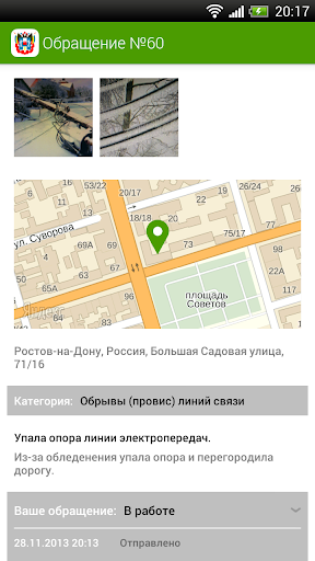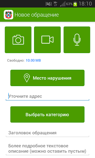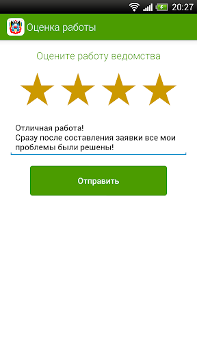 Позволяет создать электронное обращение, которое будет доставлено в органы власти, отвечающие за решение вашей проблемы. К тексту обращения можно приложить фото-/видео-/аудиоматериалы, указать точный адрес возникшей проблемы на карте. После получения ответа от представителей власти, вы оцениваете качество выполненной работы по четырехбалльной шкале.