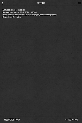 Сделать заказ у нас в такси очень просто: позвоните в диспетчерскую по номеру такси 400-44-00 и заказав такси, можете не сомневаться — наш автомобиль будет ожидать Вас в точно назначенное время, потому что мы компания который можно доверять.