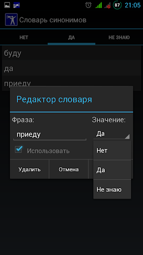 При подсчёте используются следующие варианты ответов: ДА, НЕТ, НЕ ЗНАЮ и их синонимы, соответствия которых задаются в словаре.