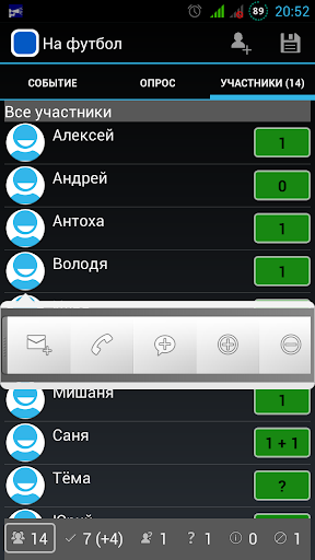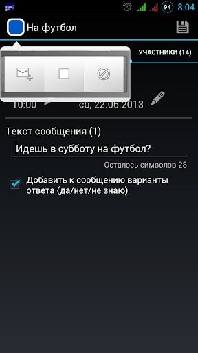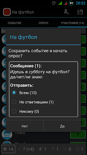 Составляем список участников и начинаем опрос. После этого будет разослан текст опроса с приглашением (Едешь завтра на футбол?), также можно добавить к этому тексту варианты ответов «да/нет/не знаю».