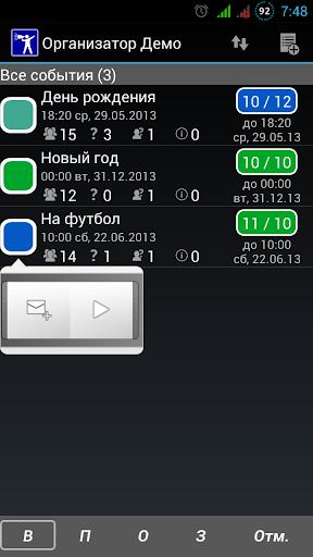 «Организатор» - незаменимый помощник для отправки приглашений при организации мероприятий, будь то игра в футбол, поход "на шашлыки", празднование Нового Года или Свадьбы.