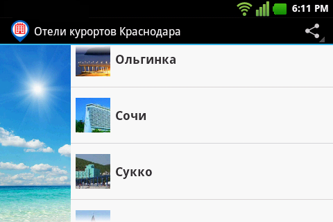 В данном приложении можно найти исчерпывающую информацию (цены, сервис, наличие мест, фотографии, расположение на карте) практически о всех значимых гостиницах, отелях, гостевых домах и пансионатах, расположенных в курортных населенных пунктах Краснодарского края. Информация распределена по городам и курортным посёлкам в алфавитном порядке.