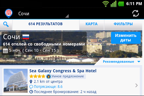 Из приложения можно без комиссии забронировать номер в понравившемся месте с помощью одного из самых надежных и известных мировых сервисов бронирования.