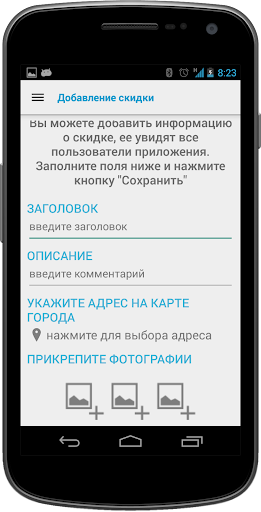 Задача: найти скидку, сфотографировать ее, описать и отправить в приложение, другие пользователи увидят ее и смогут найти. Все просто!