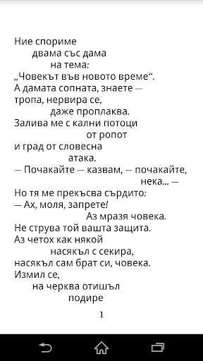 За да ползвате приложението не е необходимо да сваляте допълнителен четец. Всяко произведение е самостоятелна апликация. Вие преценявате кое от тях да оставите на телефона си или кое да изтриете. Целим да дадем възможността на хората да разполагат с библиотека от любимите си български произведения.