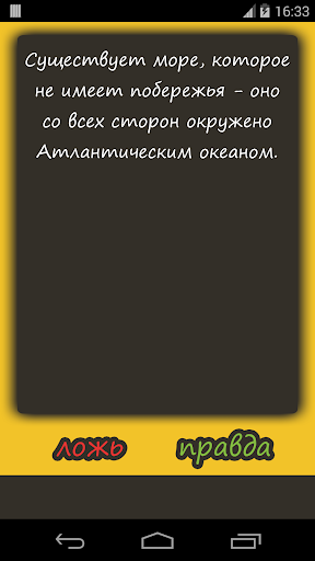 Правда или Ложь – интеллектуальная игра, известная очень многим с детства. Вам предлагаются утверждения из различных областей с которым Вы можете согласиться или же не согласиться.