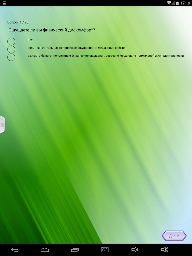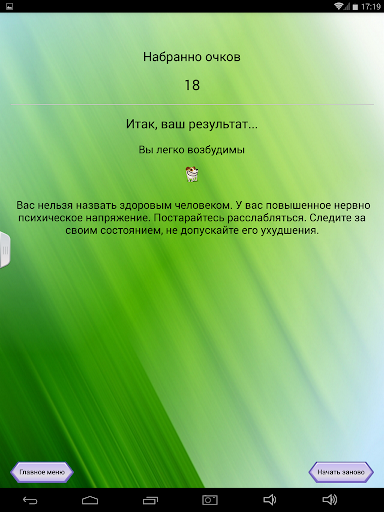 Приложение является бесплатным. Содержит пять психологических тестов. С помощью этих тестов вы сможете: узнать ваш уровень общительности; понять, насколько вы жизнелюбивы; определить, легко ли вас вывести из себя. Так же вы сможете проверить, насколько вы честолюбивы и разобраться, находитесь ли вы в состоянии стресса. Тесты легки в понимании, приложением удобно и просто пользоваться!
