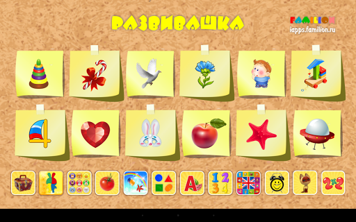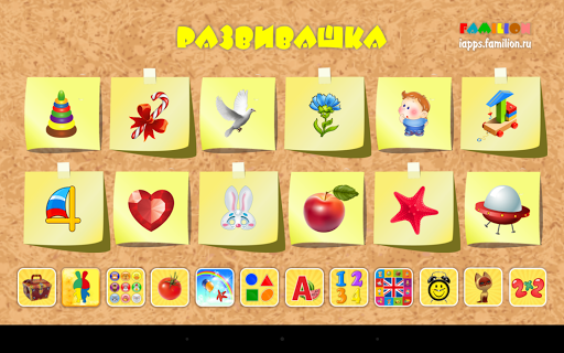 ВНИМАНИЕ! Приложение содержит рекламные блоки. Для пользователей не приемлющих рекламу существует отдельное платное приложение (https://play.google.com/store/apps/details?id=com.familion.razvivashka).
