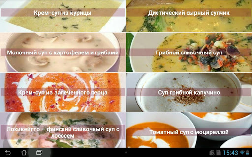 разные рецепты крем-супа: крем-суп грибной, крем-суп сырный, крем-суп из тыквы, крем-суп из брокколи, крем-суп с креветками и многое другое;