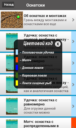 Выберите быстро подходящую оснастку, из представленных 20, используя наш цветовой код. Оснастки охватывают основные техники ловли: на стоячей воде или на течениим, поплавочная удочка, матч, донная ловля, фидер, спиннинг, карповая ловля и т.д.