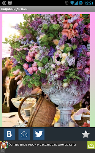 Создание дизайна для своего любимого сада стало проще, когда под рукой десятки идей. Запускайте приложение и создавайте свой собственный уникальный сад, используя наши примеры. Самые интересные записи добавляйте в избранное и делитесь ими с друзьями во ВКонтакте и Twitter.