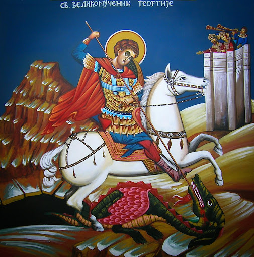 Житийная икона св. Георгия. В клеймах можно разглядеть различные пытки, в том числе и те, которых нет в стандартном списке — например, как его жгут в медном раскалённом докрасна быке