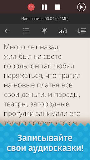 Хотите слушать аудиосказки в своем исполнении? Возможность записи своего голоса поможет вам в этом. Специальная кнопка "Моя запись" в главном меню позволит проигрывать аудиосказки, озвученные вами.