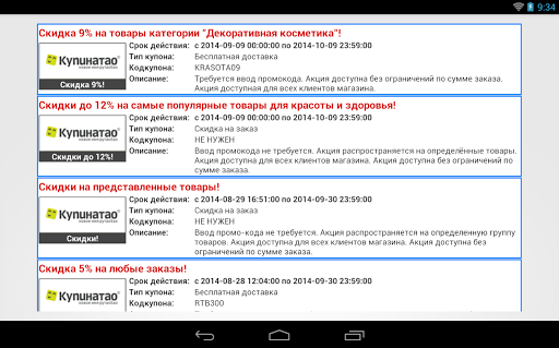 В приложении собрана информация по действующим в данный момент скидкам, распродажам и иным акциям, проводимыми интернет магазинами. Информация о скидках обновляется ежедневно, так что вы никогда не пропустите выгодные предложения.