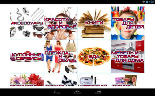 В приложении представлены магазины следующих направлений: Аксессуары, Красота и Здоровье, Книги, Товары для детей, Купонные сервисы, Одежда и Обувь, Еда, Мебель и товары для дома, Подарки и Цветы, Товары для спорта, Цифровая и Бытовая техника, Товары для животных.