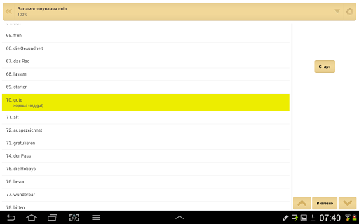 Мобільний самовчитель німецької мови СЛОВА БІГОМ Golden Start включає що все добре зарекомендували себе і перевірені функції програм: “мемо-методіка MARIDI”, “Віртуальний вчитель”, “Тренажер вимови”, “Тренажер правопису”, “Самоконтроль”, “Діалоги”, транскрипція, “Граматика”, “Фонетика” та інші. Також, ви зможете безкоштовно встановити блок “Вираження емоцій”.
