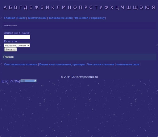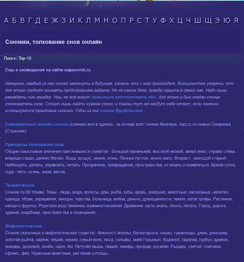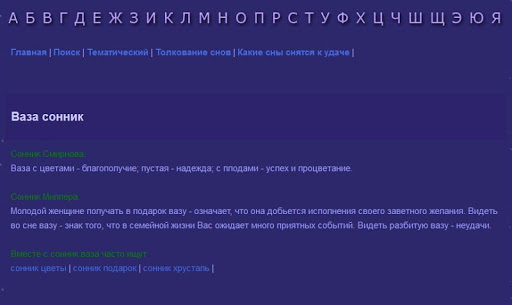 Сонник 2015. Толкование снов. - это уникальное приложение, в котором вы можете воспользоваться поиском по нужной фразе. Так же есть алфавитный указатель.