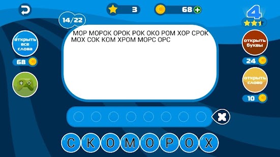 Чем больше слов Вы угадаете, тем больше получите очков. Также за угаданные слова даются монетки, которые можно использовать для покупки различных подсказок, открывать первые буквы в словах или слова целиком. Цель игры - решить все задания и пройти все уровни!