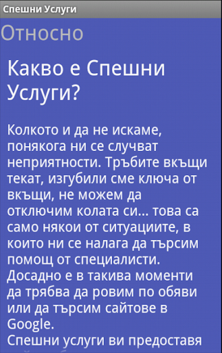 Със Спешни Услуги намирате информацията която ви е необходима за секунди. Приложението е малък и удобен каталог, който винаги е в джоба ви и който ви помага да се свързвате с правилните хора без да се налага да ровите в Интернет и да хабите и без това изопнатите си нерви.