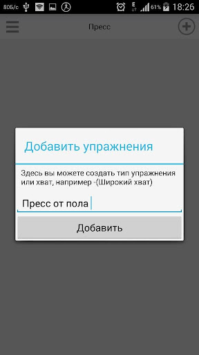 В приложение красивый и удобный интерфейс, в боковом меню перечислены все виде упражнений для развития мышечной массы и можно добавлять их если в списки отсутствует какое либо упражнения, при выборе типа упражнений вы можете создать его вид, к примеру "Турник - Широкий хват,Узкий хват", и при занятие вы заносите свои результаты в приложения, благодаря этому вы можете смотреть вы со временем стали больше делать нагрузку или нет!