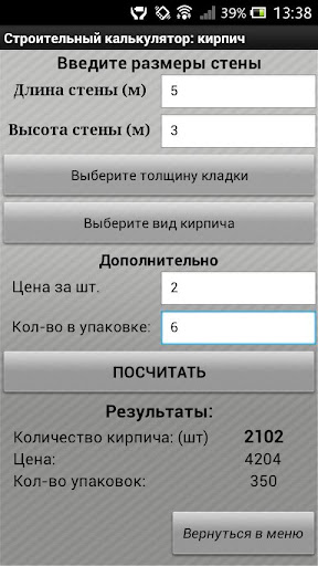 Данный строительный калькулятор незаменим при расчетах количества кирпичей и облицовочного материала.