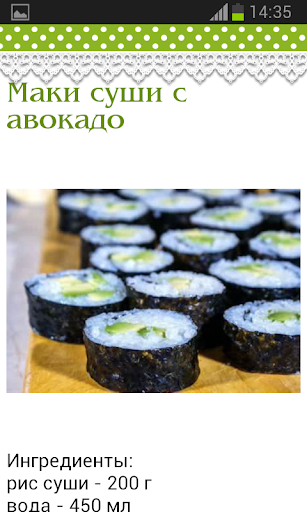 Теперь практически любой желающий может почувствовать себя японцем, или как минимум настоящим суши – мастером. Для этого достаточно иметь желание, нужные продукты, правильный рецепт и немного вдохновения! В этой программе мы собрали рецепты различных суши и роллов, которые легко можно приготовить самостоятельно. Практически любой желающий справиться с задачей, поскольку все рецепты представлены в виде пошаговых инструкций с фотографиями! Теперь для того, чтобы полакомиться полюбившимися многим деликатесами вовсе не нужно идти в дорогой ресторан или лететь в Токио! Все можно приготовить собственными руками!