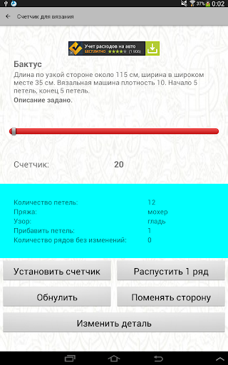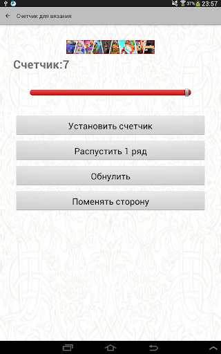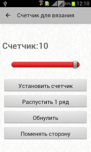 Если вам нужно просто считать провязанные ряды, вы можете делать это, просто перемещая ползунок счетчика пальцем. Вы можете устанавливать любые показания счетчика, распускать ряды, менять направление вязания.