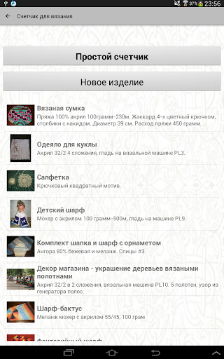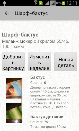 Вы также можете создавать собственный журнал ваших изделий. Создайте новое изделие, добавьте к нему изображения (схемы, выкройки, фотографии) и детали. Для каждой детали собственный счетчик запомнит для вас, сколько вы провязали рядов, когда бы вы к нему не вернулись.