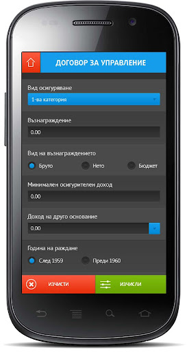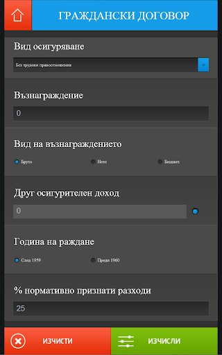 Калкулатора служи за изчисляване на възнаграждения на лица, работещи по трудов договор, граждански договор, или ДУК, както и за изчисляване на осигурителните вноски за самоосигуряващи се лица.