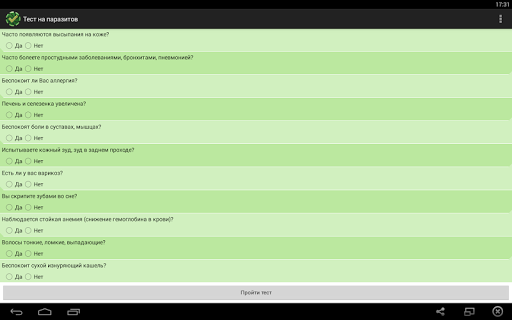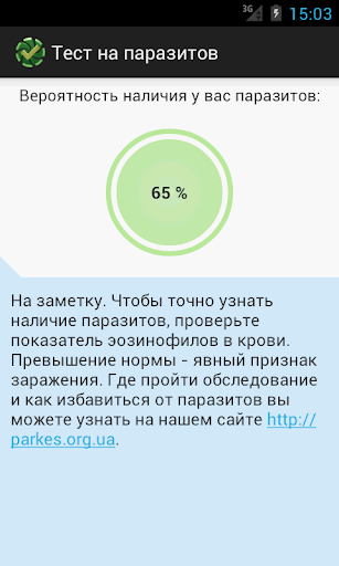 Чтобы узнать вероятность наличия у вас паразитов, нужно ответить на несколько вопросов. Вопросы представляют из себя самые распространенные симптомы паразитов у людей. Чем больше ответов, тем точнее результат. Тест не показывает какие именно паразиты присутствуют, показывает только вероятность их присутствия в процентах. Тест возрастных ограничений не имеет. Приложение не требует подключения к интернет и абсолютно БЕСПЛАТНО. Приложение доступно на двух языках: русском и английском. Минимальная версия Android: 2.2.