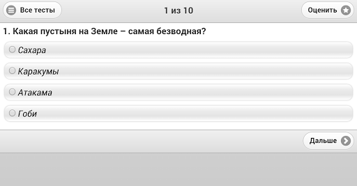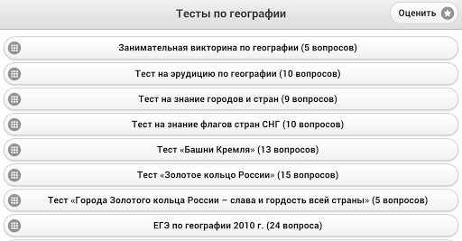 Использовать эти тесты для проверки знаний по географии и подготовки к ЕГЭ. Тесты по географии для подготовки к ЕГЭ / ГИА, тесты для школьников средних и старших классов. В приложении можно пройти тесты по географии бесплатно. Тесты содержат пробные варианты ЕГЭ по географии. Тесты по географии и разделены по школьной программе, классам, ЕГЭ. По окончании теста по географии вы увидите количество правильных и не правильных ответов и узнаете свой балл по пятибалльной шкале.