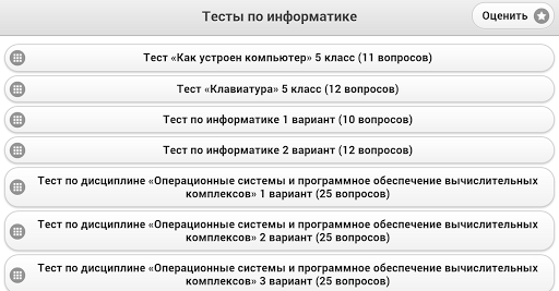 Тесты по информатике на проверку знаний о программном обеспечении, общей архитектуре компьютеров, устройстве и принципах работе ЛВС и околокомпьютерного оборудования. Приложение тесты по информатике содержит следующие разделы. Как устроен компьютер. Операционные системы и программное обеспечение вычислительных комплексов. Моделирование и формализация. Алгоритмы: виды, свойства. Компьютерные вирусы. Базы данных. Основные функции. Информационно-коммуникационные технологии работы в компьютерной сети. По окончании теста по информатике вы увидите количество правильных и не правильных ответов и узнаете свой балл по пятибалльной шкале.