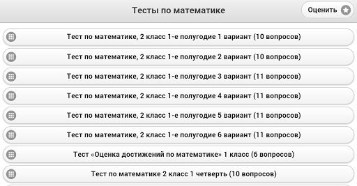 Приложение содержит различные тесты по математике: сложные и не очень, для младших, и 9 классов школы. Все тренировочные тесты по математике бесплатны, можно потренироваться в решении задач по разным разделам школьной математике. На этих тестах можно тренироваться перед контрольной. Если результат теста слаб, не огорчайтесь, повторите пройденный материал и попробуйте еще раз пройти тест по математике. По окончании теста по математике вы увидите количество правильных и не правильных ответов и узнаете свой балл по пятибалльной шкале.