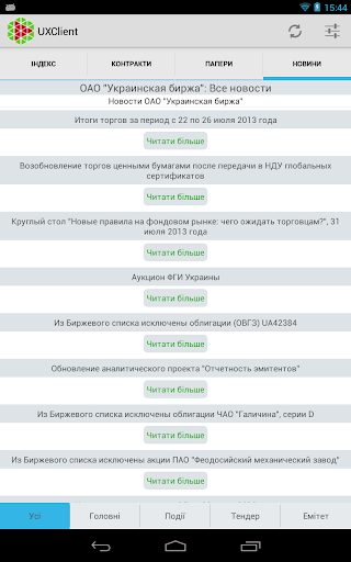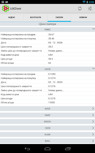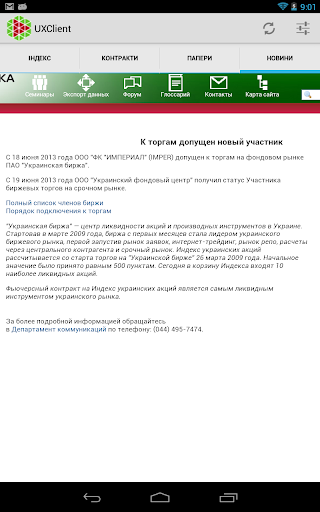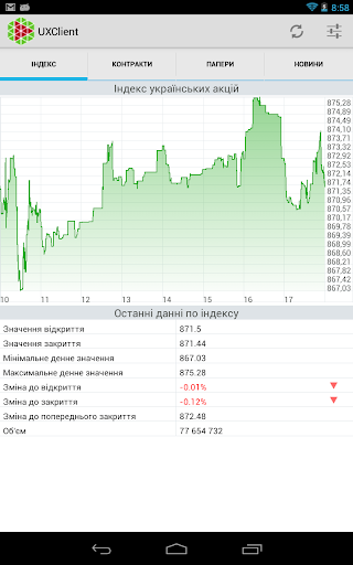 Клієнтський мобільний додаток для сайту української біржі (www.ux.ua) надасть Вам можливість швидко і легко переглянути основні дані індексу української біржі, контрактів, цінних паперів та новин.
