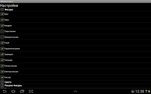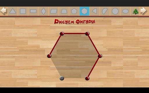 Доступны 12 фигур, 12 цветов и 15 картинок для рисования.