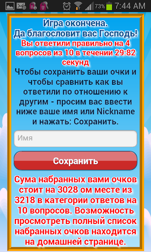В этом приложении после вопроса предлагается выбрать правильный ответ из 4 вариантов и после вашего выбора ответа на вопрос, она покажет вам, если ваш ответ правильный или нет и покажет для основы место из Писания.
