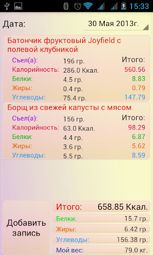 С помощью разнообразных диет и калькуляторов, можно узнать много нового о режимах питания и вести свой дневник, который очень помогает в курсе похудения, да и вообще - вести здоровый образ жизни. График БЖУ помогает отслеживать весь архив из дневника в удобном графическом виде.