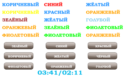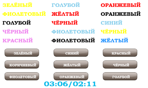 Нажимайте на кнопки внизу, на которых написан цвет, соответствующий цвету текущего слова вверху. Слова следуют слева направо и сверху вниз. Например, первое слово "СИНИЙ" нарисовано красным цветом, значит, надо нажать кнопку "КРАСНЫЙ".