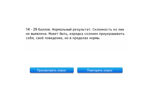 14 - 29 баллов. Нормальный результат. Склонность ко лжи не выявлена. Может быть, изредка склонен приукрашивать себя, своё поведение, но в пределах нормы.