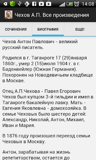 Все произведения Чехова в одном приложении! Читайте русского классика через свой мобильный телефон! Приложение имеет удобный рубрикатор по названиям и жанрам произведений.