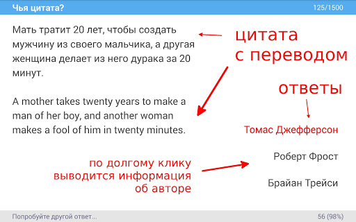 Данная версия программы содержит 1500 отборных текстов. Процесс запоминания построен на тесте, в ходе которого пользователь набирает баллы за правильные ответы. Успеваемость отображается в виде процентов от максимально возможных показателей. В любой момент приложение можно закрыть, его текущее состояние сохраняется. В настройках предусмотрены две темы оформления: светлая и тёмная. Также пользователь может изменить размер шрифта, выравнивание цитат и ответов в портретном режиме и настроить отступы для своего экрана. Ответы сопровождаются звуковыми эффектами. Долгий клик по имени автора цитаты выведет краткую биографическую справку. По просьбе пользователей некоторые цитаты переведены на английский язык (по умолчанию опция отключена, необходимо зайти в настройки).