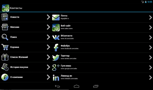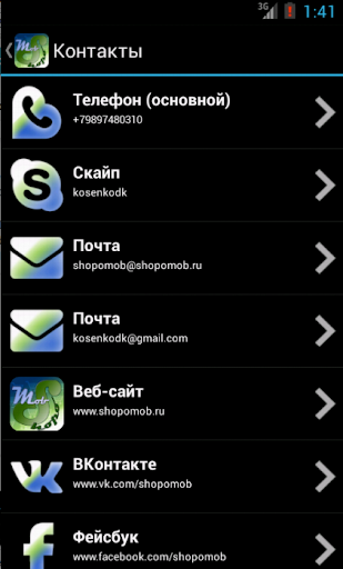 - Контакты (набор номер телефона, скайп-звонок, адреса сайтов, электронной почты);
