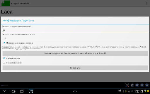 Перед использованием текста в речь возможностей, Вам необходимо системе тексте синтезатор, а SVOX или IVONA с польской голос установлены и активны в вашем Android (голос может быть установлен с экрана настройки в приложении). Польский голос будет адаптирована к эсперанто.