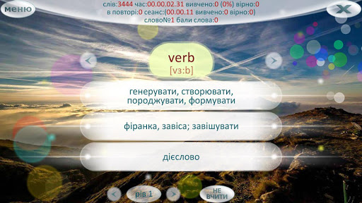 Словник розбитий на цикли, в кожному по замовчуванні 25 слів (в меню можна змінити на іншу кількість). На англійське слово вам представлені 3 варіанти відповіді.