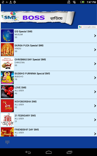 মাঝে মাঝে smsলিখতে অনেক বিরক্ত লাগে । কেমন sms লিখবো, কেমন হবে, কি মনে করবে? এই Application এ অনেক এসএমএস আছে। শুধু পছন্দ করে পাঠিয়ে দিতে পারেন আপনার প্রিয় মানুষ কে।