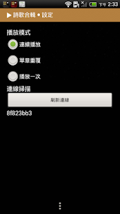 說明:此APP為雲端版本,預設為『連線模式』,需上網播放。針對特殊需要,另有提供『下載模式』,請至此APP『設定頁面』進行調整,下載後即可離線播放。另外,支援背景連續播放,即使螢幕自動鎖定後,仍可連續播放。播放頁面有四個按鍵,分別為《前一首》、《播放/暫停》、《停止》、《下一首》。由於播放是在背景執行,當不播放時,要點選停止來結束背景服務。若沒有結束背景服務,當開啟多個服務後,記憶體較小的裝置有機會發生記憶體不足的情形。任何使用上的問題,歡迎來信: