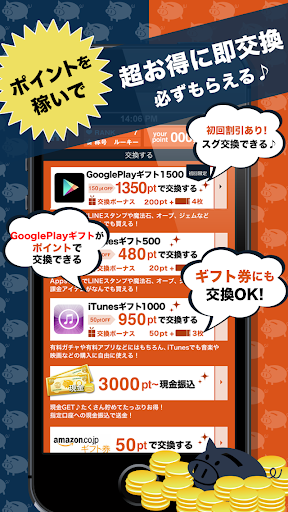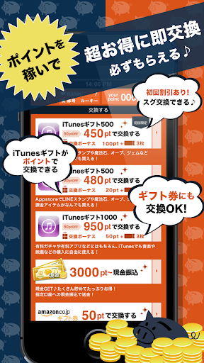 貯まったポイントで、GooglePlayギフトコード、現金、Vプリカ、Amazonギフト券、iTunesギフトコードなどに、何度でもいつでも交換できるので、お小遣い(おこづかい)としてすぐに活用できます♪